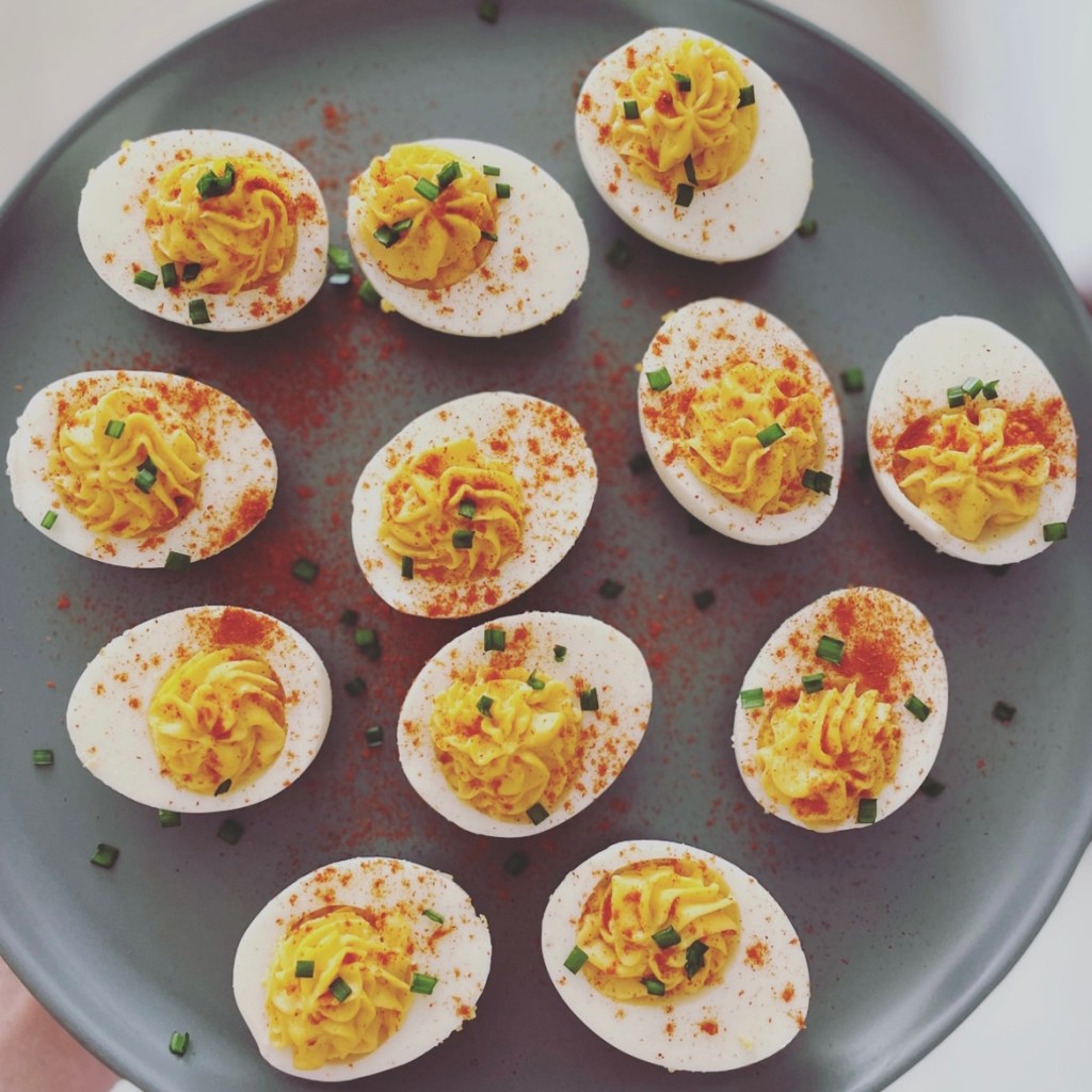 I followed Nigella’s instructions for boiling eggs which I hadn’t done before, but then I thought it safe given I’ve never boiled this many eggs in one go (I actually boiled six more than necessary and had to split between two pans). The process of mashing up the filling with the yolks was a breeze, and piping into the boiled whites was all well and good. That is until a thick blob blocked the nozzle and the filling started seeping out the stitching! It took me back to my days as a Sales Clerk in Thorntons, I would pipe messages with icing onto chocolate slabs, and have been my mum’s go-to piper ever since.