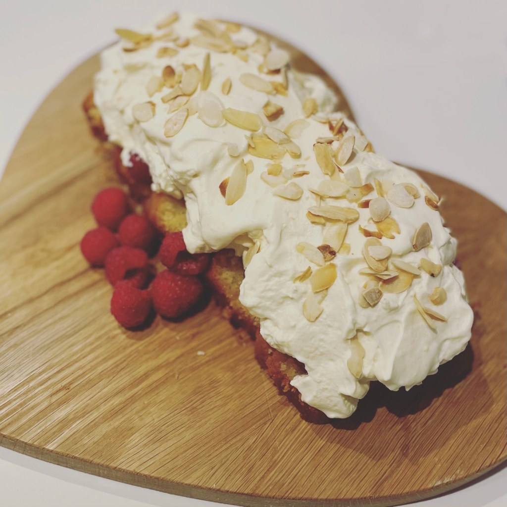 The syllabub (I think my new favourite word), was made up soon before eating and slathered on top of the cake and raspberries.