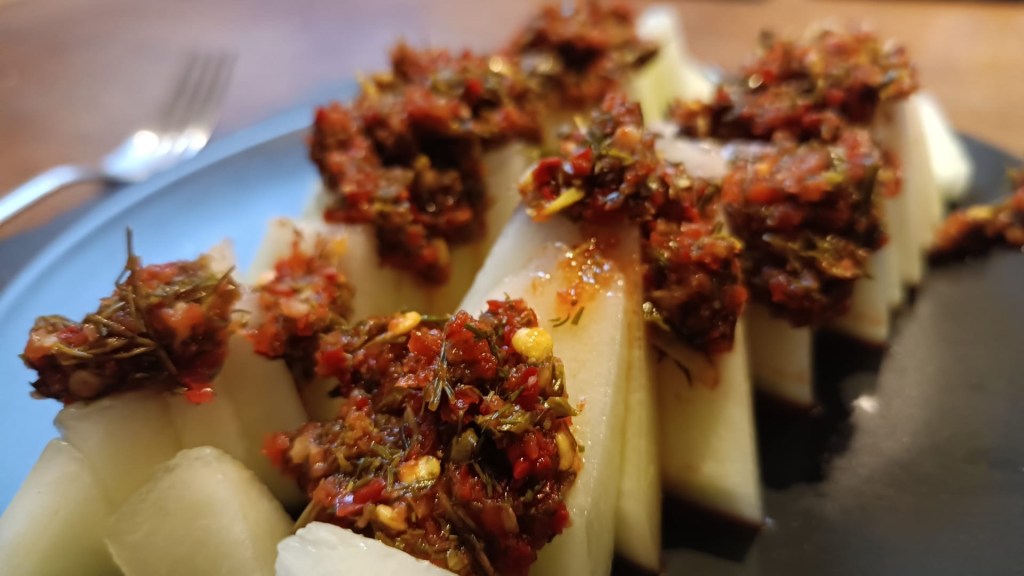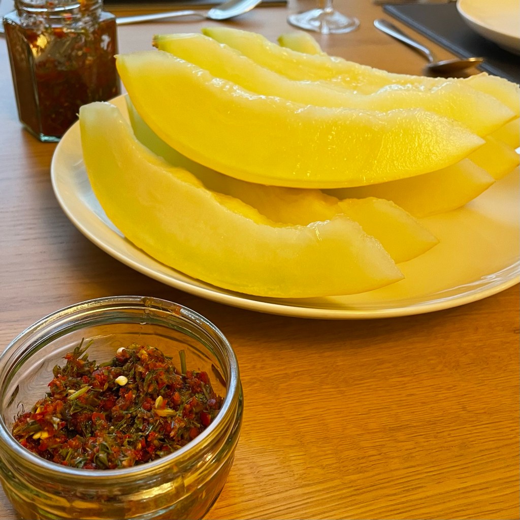 I don’t think I’ve ever had a Georgian food before making this recipe. The heat of the relish (known as Adzhika) against the cool of the melon really does make the tongue tingle, and everyone at the table enjoyed the fire of it.