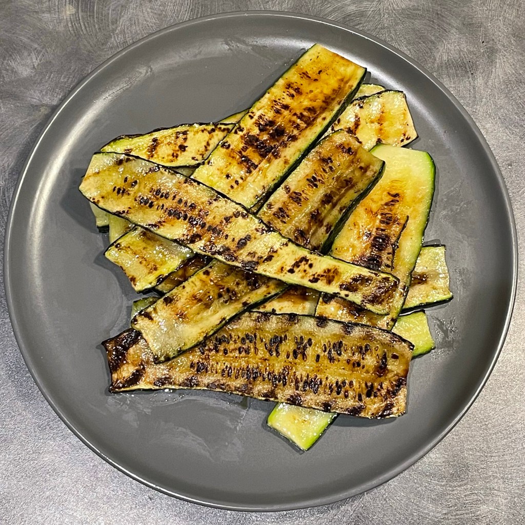 This accompaniment of griddles courgettes is a super simple side that can be created during the final minutes of your main cooking or resting. Courgette’s still seem fairly flavourless to me when compared to other veg, so the addition of lemon juice and salt to the slices adds a tasty punch and crunch here (it is chunky Maldon salt flakes that are used here).